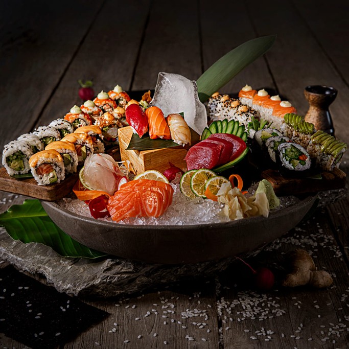 Chef's Sushi Platter, one of the indispensable traditions of Asian cuisine and one of the most important flavors of our cuisine; Sashimi, Nigiri, Maki and Rolls and Shibori's precious classics served with our daily fresh seafood.